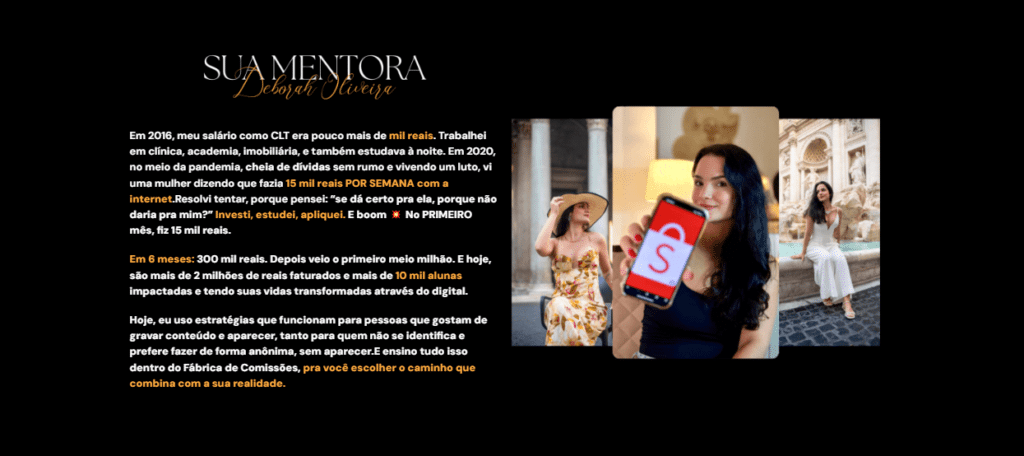 O curso Fábrica de Comissões, criado por Déborah Oliveira, tem despertado o interesse de pessoas que desejam ganhar dinheiro na internet como afiliadas de grandes marketplaces, como Shopee, Amazon, Shein, Magalu e Mercado Livre.